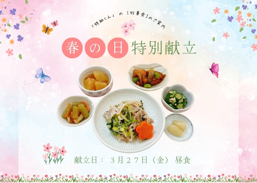 「特助くん」では、月に一度、日々の食事からも四季を感じていただけるよう、季節に合わせた行事食をご用意しております。